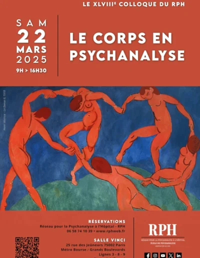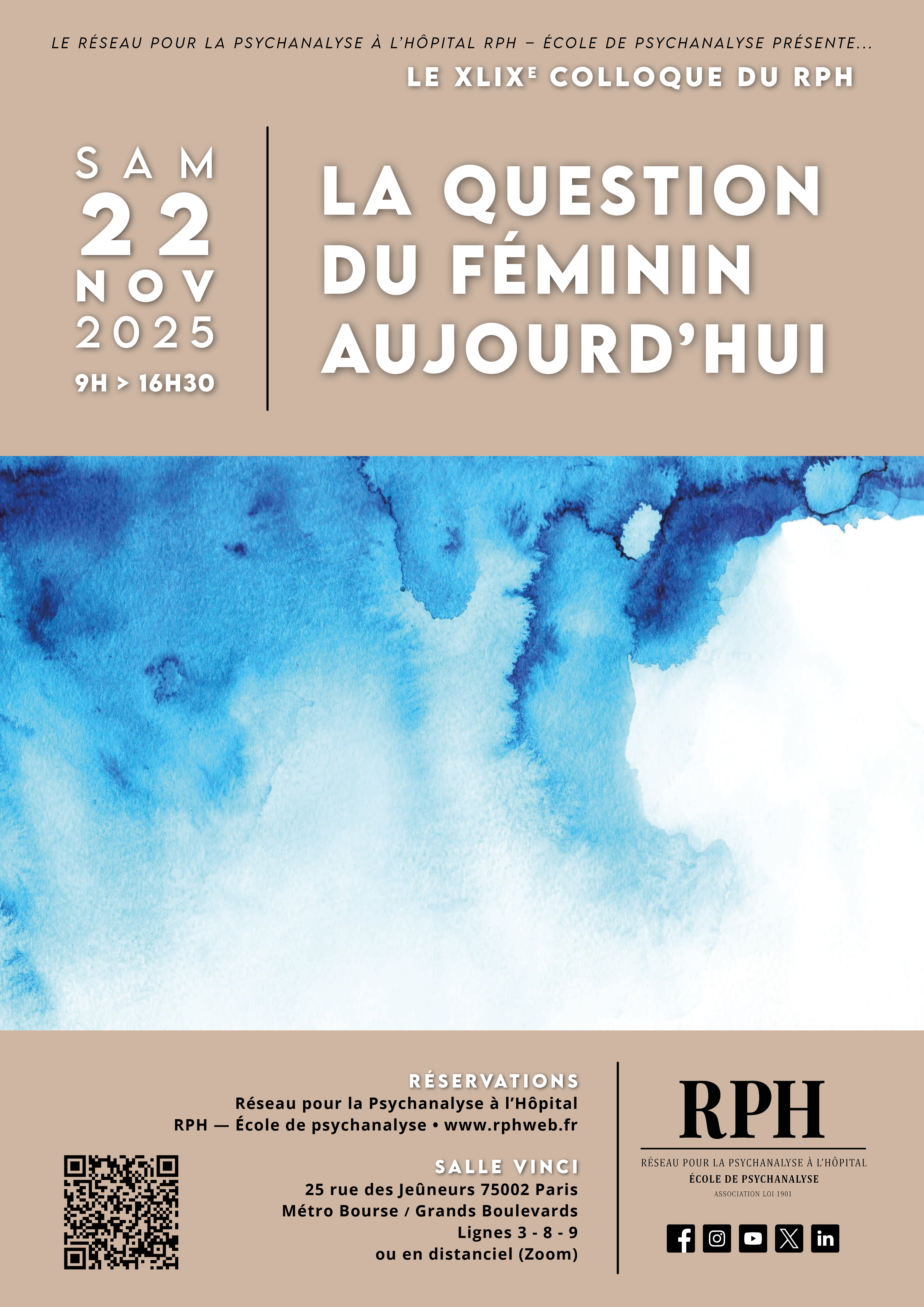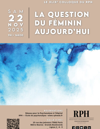 Voici les affiches des colloques et journées d’étude proposés par le RPH sur des thématiques en lien avec la clinique psychanalytique, médicale, ou des thématiques de société. Les actes de ces journées sont accessibles dans la Revue de Psychanalyse et Clinique Médicale, disponible sur le site du RPH.